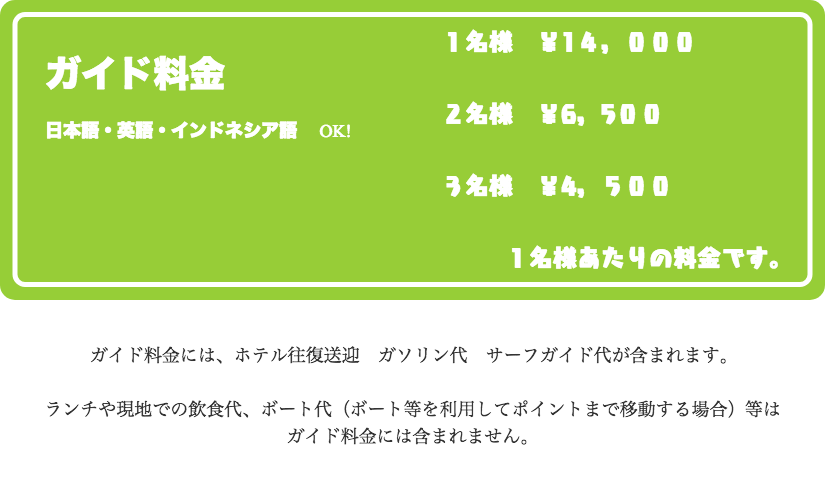 その日の波のサイズや、ご自身の希望の波のサイズに合わせてガイドが一番いい波のポイントへお連れ致します。お客様のコンディションを事前にお伝えしておくと、よりスムーズです。